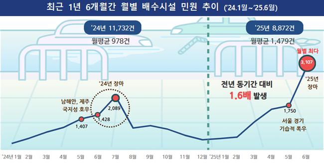 배수시설 민원은 지난해 월평균 978건에서 올해 들어 1,479건으로 크게 증가했다. 2025년 상반기 민원 건수만 해도 전년도 같은 기간보다 약 1.6배 늘어난 수치다.