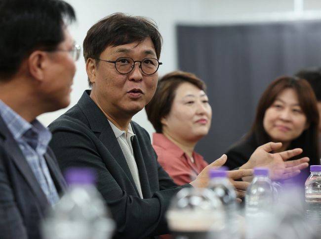 최휘영 문화체육관광부 장관이 8일 서울 종로구 대학로 홍익대학교아트센터 대극장을 방문해 뮤지컬 <스웨그에이지 외쳐, 조선!>을 관람한 뒤 출연진과 관계자를 만나 `케이-뮤지컬` 진흥을 위한 의견을 나누고 있다.