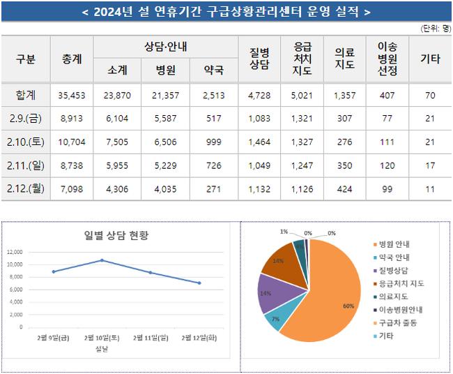 지난해 설 연휴 기간 동안 119구급상황관리센터를 통해 총 35,453건의 의료 상담이 이루어졌으며, 병·의원 안내 요청이 가장 많았다. 하루 평균 상담 건수는 8,863건으로 평소 대비 약 46% 증가한 수치다. 특히 설날 당일에는 상담 건수가 급증했으며, 주요 상담 내용은 병원과 약국 운영 정보, 응급 처치 지도 등이 포함됐다.