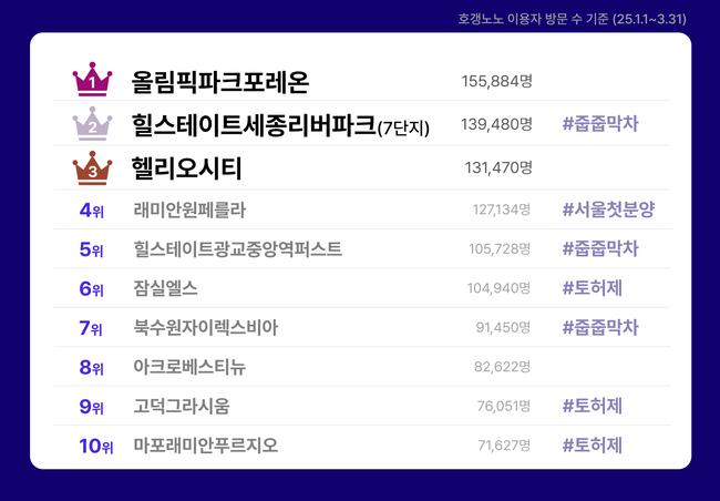 국내 대표 프롭테크 기업 직방이 운영하는 아파트 종합 정보 플랫폼 ‘호갱노노’가 2025년 1분기(1~3월) 동안 가장 많은 방문자 수를 기록한 인기 아파트 랭킹을 3일 공개했다.