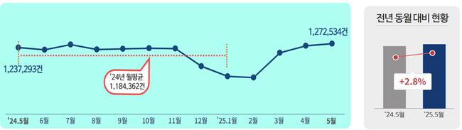 5월 민원 발생량은 약 127만 3천 건으로, 4월 125만 3천 건 대비 1.6% 증가하였으며 전년도 5월(124만 건)과 비교 시 2.8% 증가했다.
